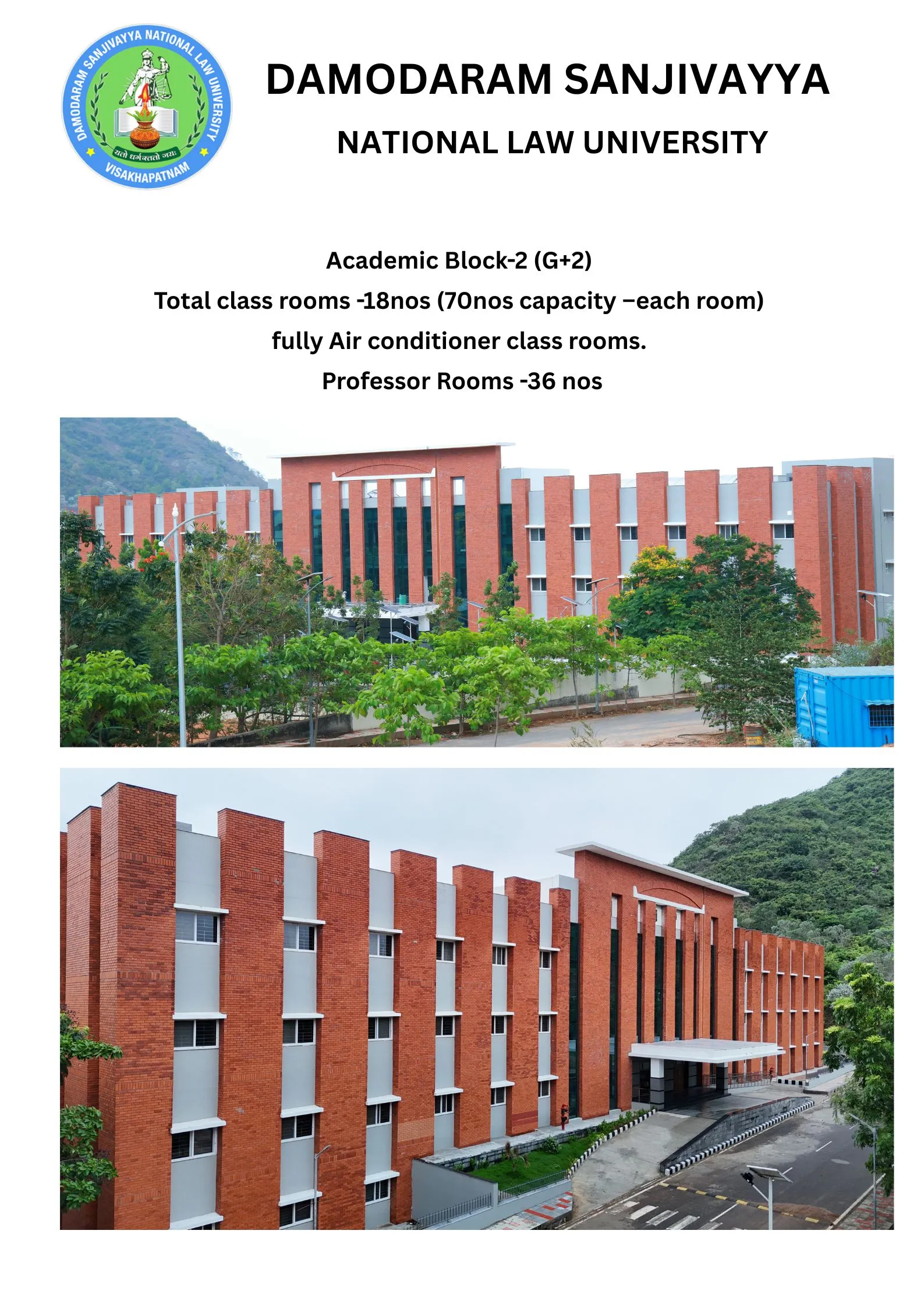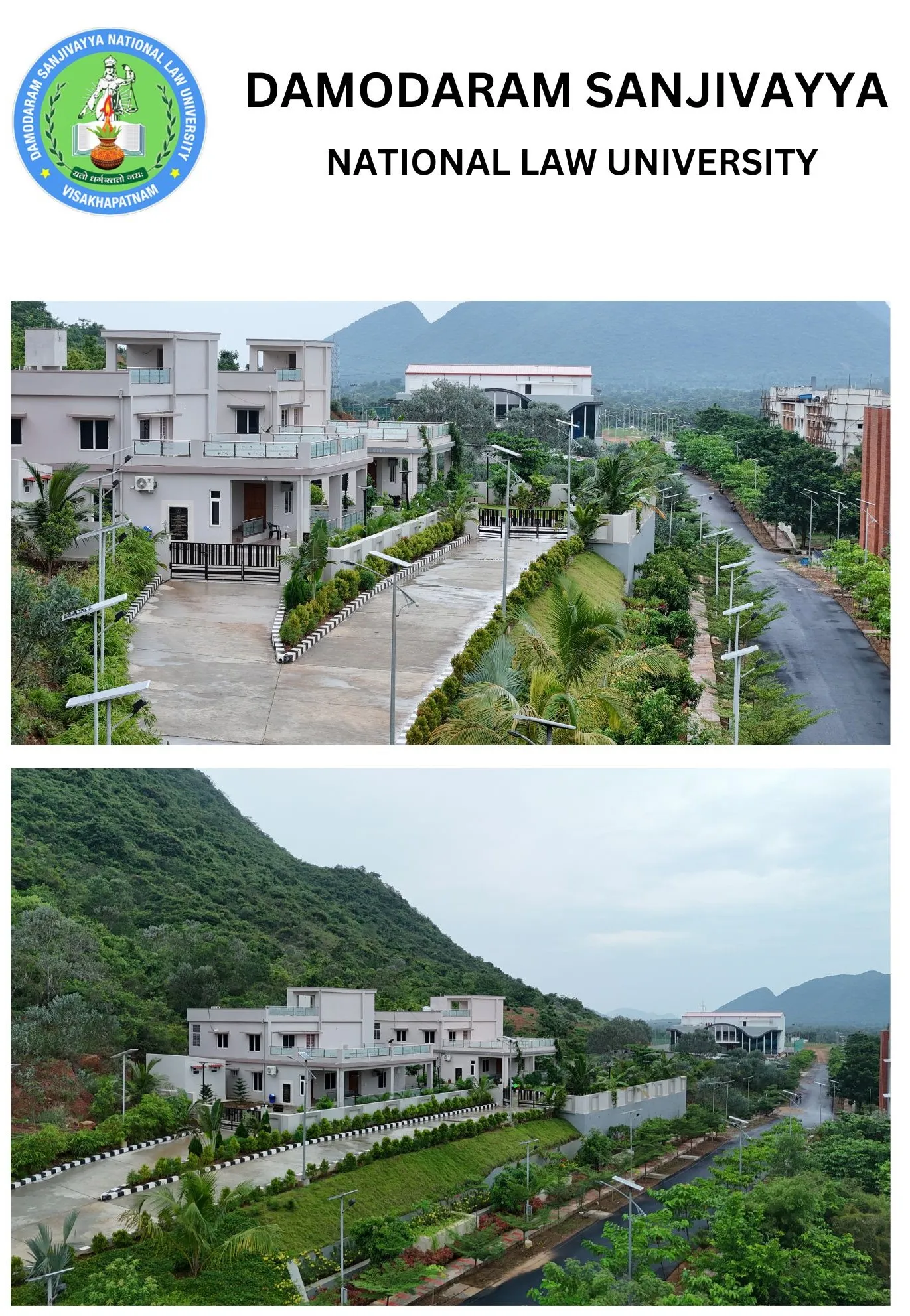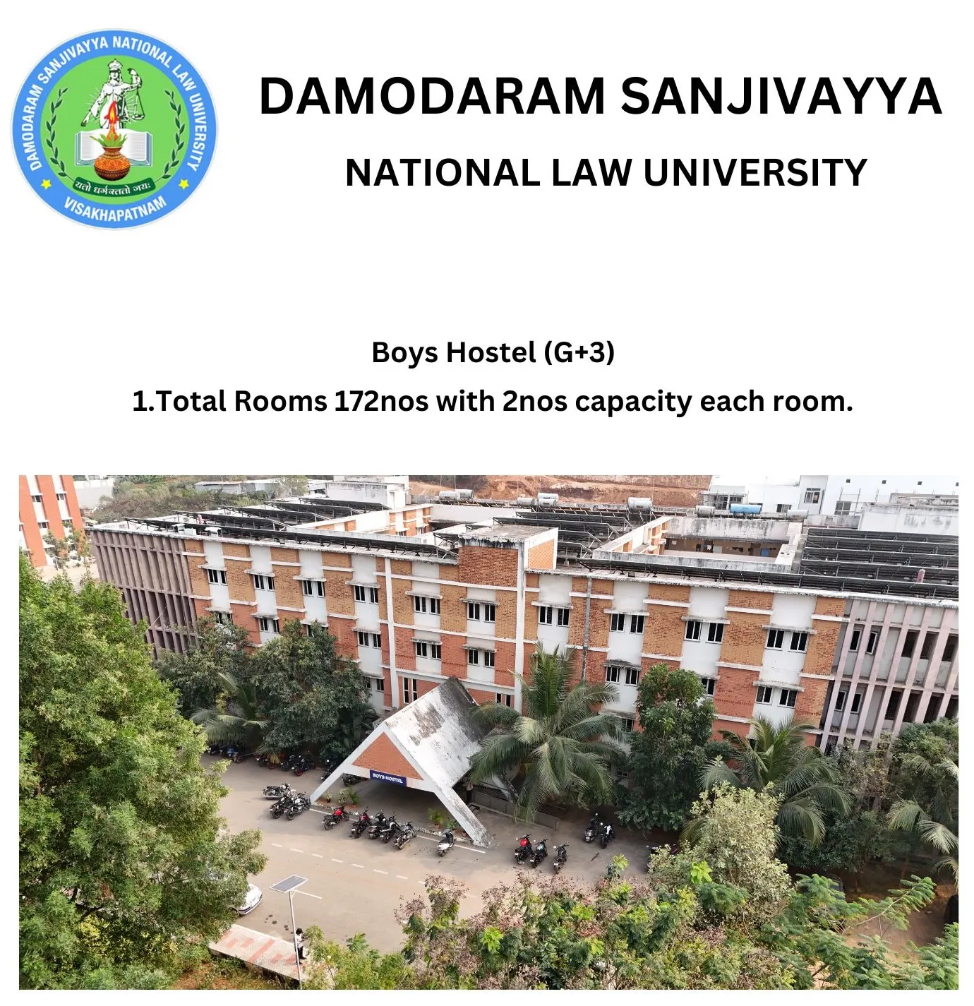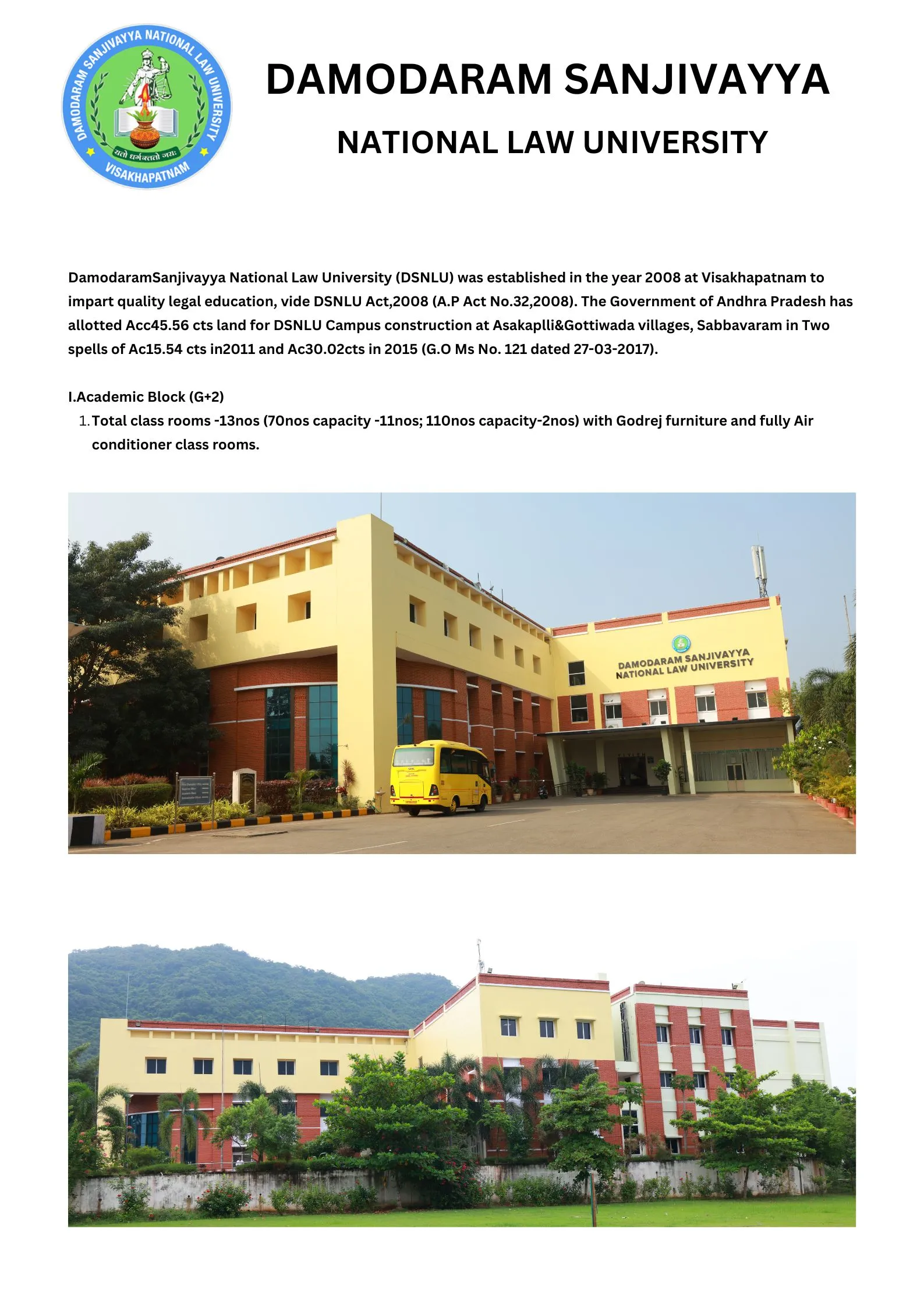 DSNLU state-of-the-art, technologically advanced and eco-friendly campus is situated in 45.5 acres abutting the hill. DSNLU campus has fully air-conditioned Academic Block, Wi-Fi enabled with LAN facility. The University is a part of National Knowledge Network whereas the Government of India has provided 1GBPS connectivity to the University. Boys and Girls Hostels consists of 160 rooms each with two students’ accommodation in a room as per the University Rules. DSNLU has canteen building accommodating 350 students at a time. DSNLU has 11 KV Sub-station with two 320 KVA backup generators, 1.5 KLD capacity Sewage Treatment Plant, Andhra Bank ATM. 350 Kwp Roof Top Solar Power Plant is also established. The students are facilitated with a world-class library which provides access to online resources like Westlaw India, Hein Online, SCC online, Lexis Nexis, Kluwer Competition Law, Kluwer IP Law, Kluwer Arbitration, Taxmann, JSTOR, Economic and Political Weekly and Manupatra for intensive research. The online resources are available through RemoteXs. Further, DSNLU adopts Turnitin, an anti-plagiarism web tool. All the classrooms are equipped with LCD projectors, internet and public address system. DSNLU Moot Court Hall is a splendor in its own way. The University has seminar and conference hall that are made available for conducting meetings and organizing guest lectures.