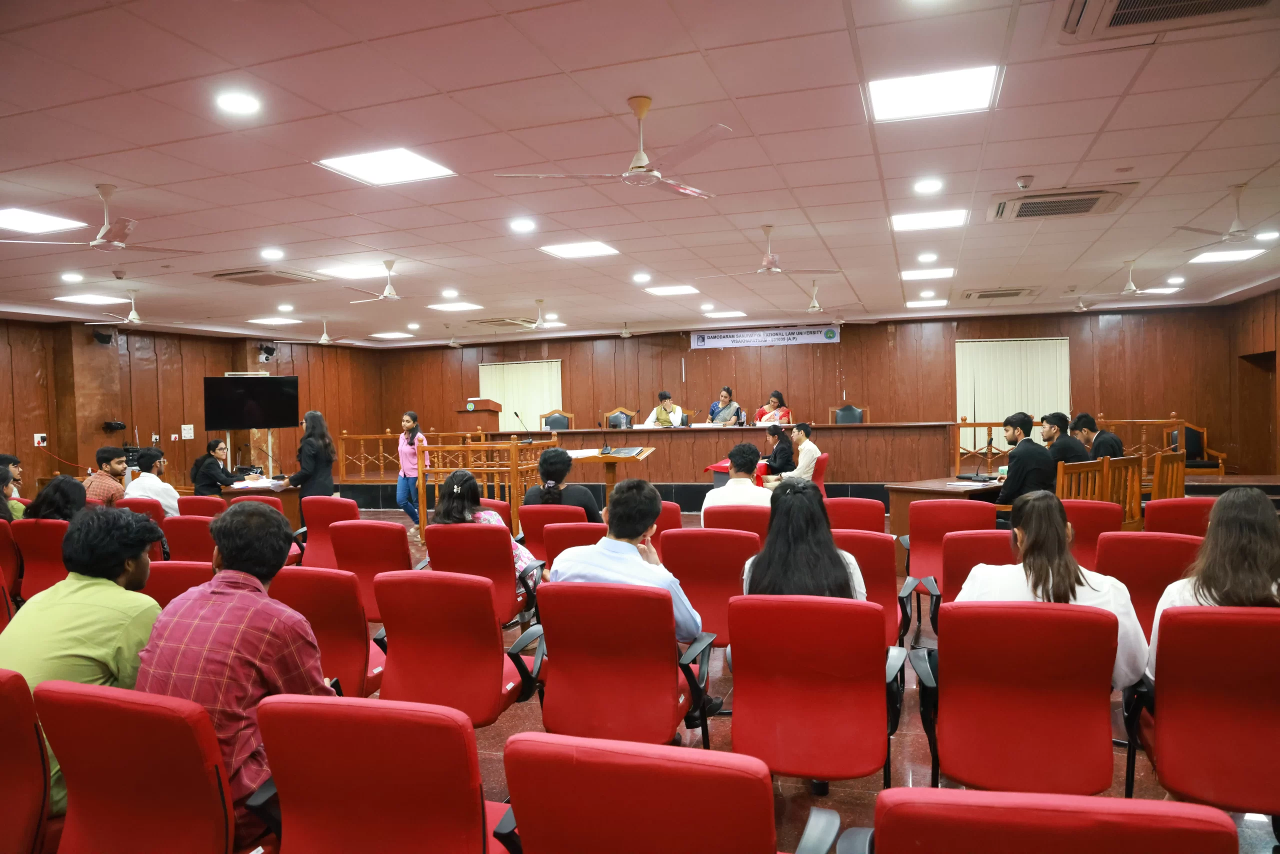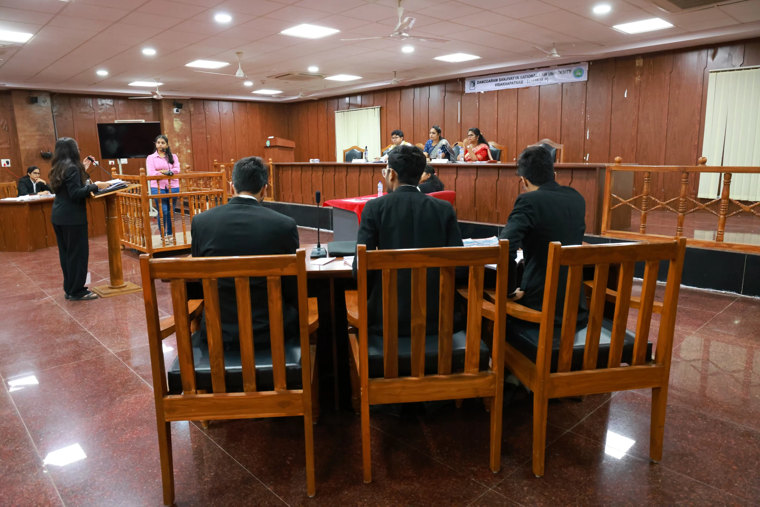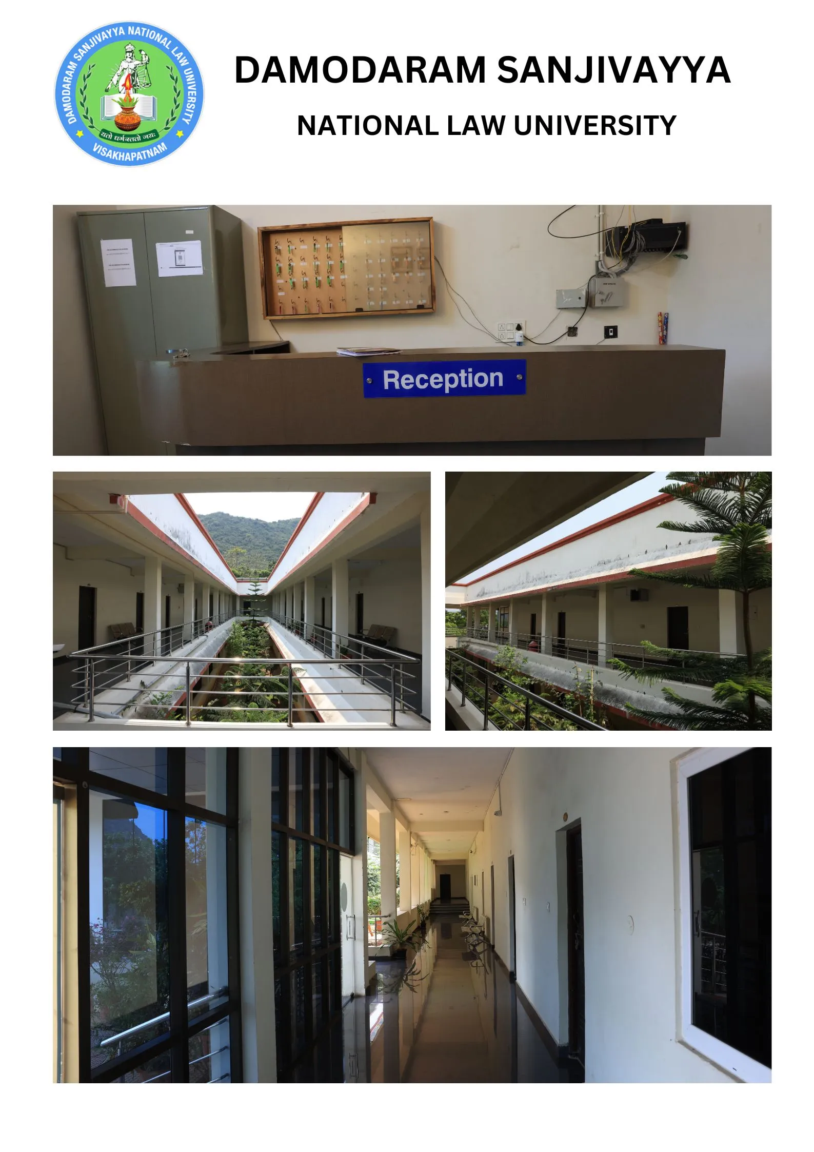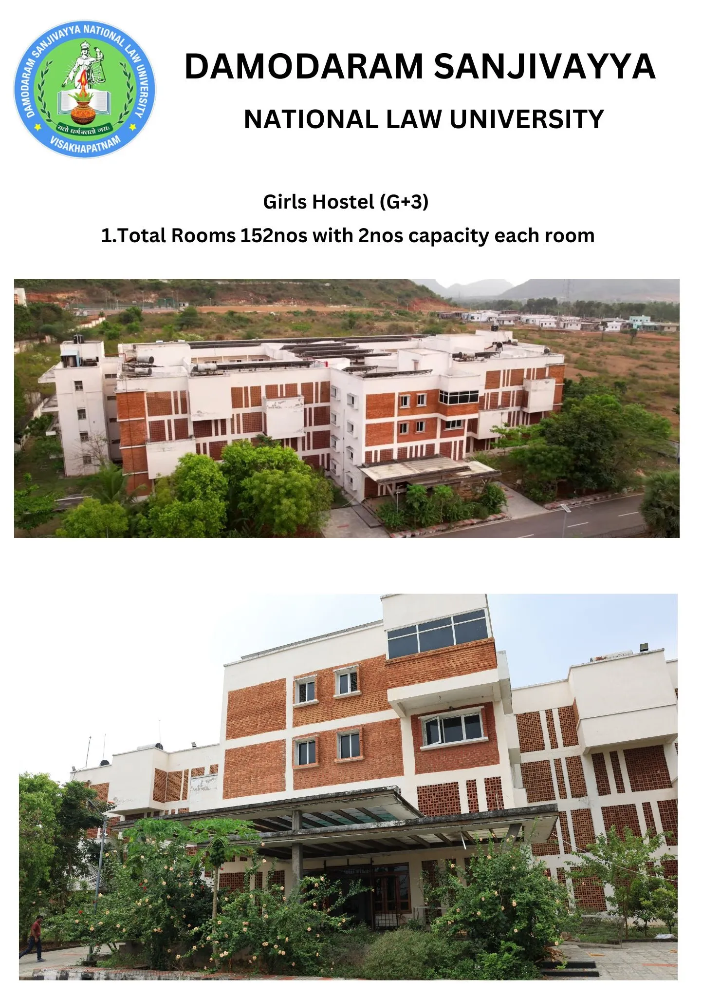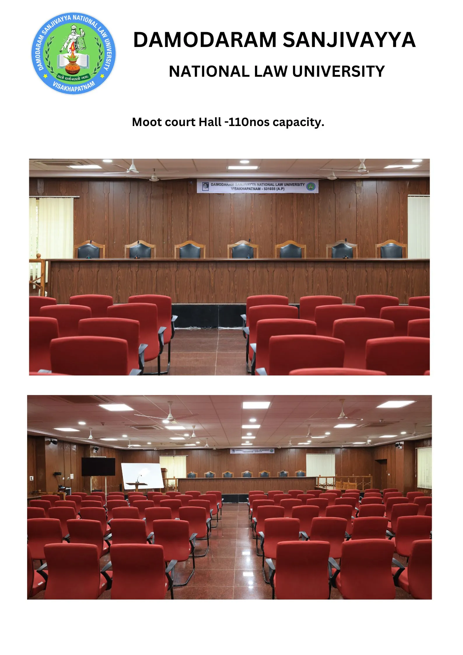 DSNLU state-of-the-art, technologically advanced and eco-friendly campus is situated in 45.5 acres abutting the hill. DSNLU campus has fully air-conditioned Academic Block, Wi-Fi enabled with LAN facility. The University is a part of National Knowledge Network whereas the Government of India has provided 1GBPS connectivity to the University. Boys and Girls Hostels consists of 160 rooms each with two students’ accommodation in a room as per the University Rules. DSNLU has canteen building accommodating 350 students at a time. DSNLU has 11 KV Sub-station with two 320 KVA backup generators, 1.5 KLD capacity Sewage Treatment Plant, Andhra Bank ATM. 350 Kwp Roof Top Solar Power Plant is also established. The students are facilitated with a world-class library which provides access to online resources like Westlaw India, Hein Online, SCC online, Lexis Nexis, Kluwer Competition Law, Kluwer IP Law, Kluwer Arbitration, Taxmann, JSTOR, Economic and Political Weekly and Manupatra for intensive research. The online resources are available through RemoteXs. Further, DSNLU adopts Turnitin, an anti-plagiarism web tool. All the classrooms are equipped with LCD projectors, internet and public address system. DSNLU Moot Court Hall is a splendor in its own way. The University has seminar and conference hall that are made available for conducting meetings and organizing guest lectures.