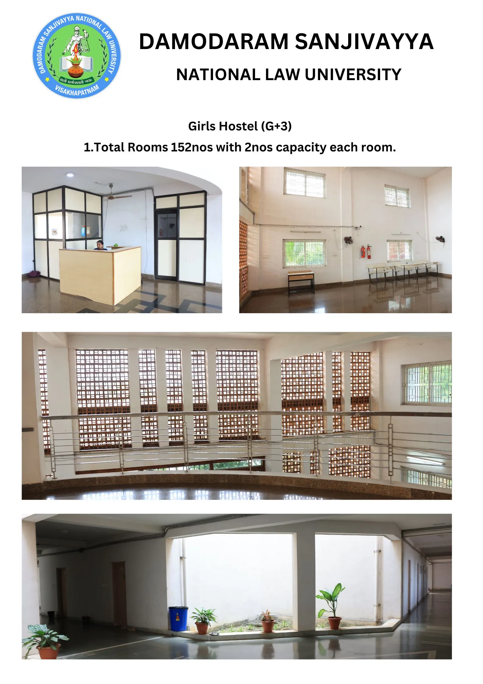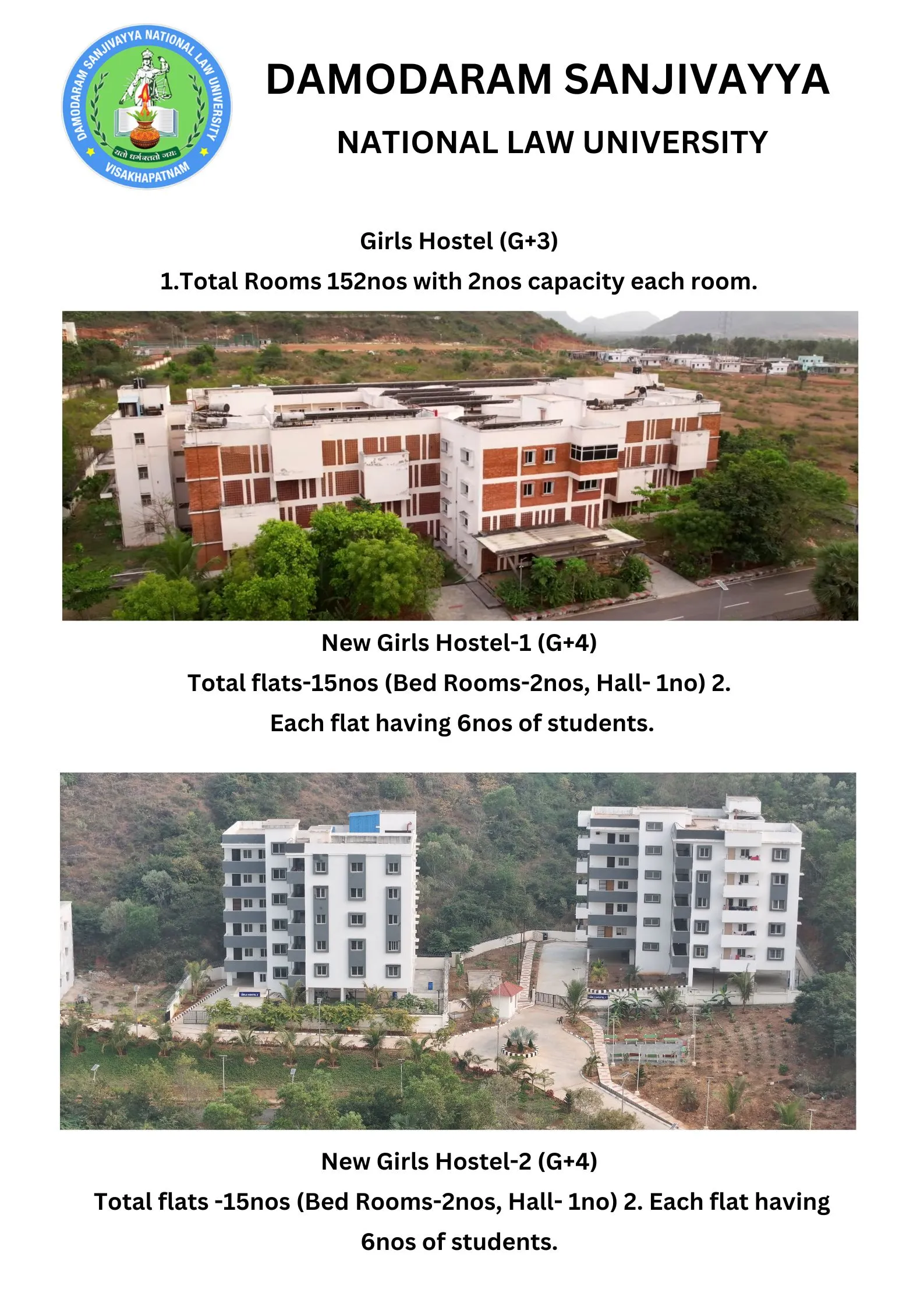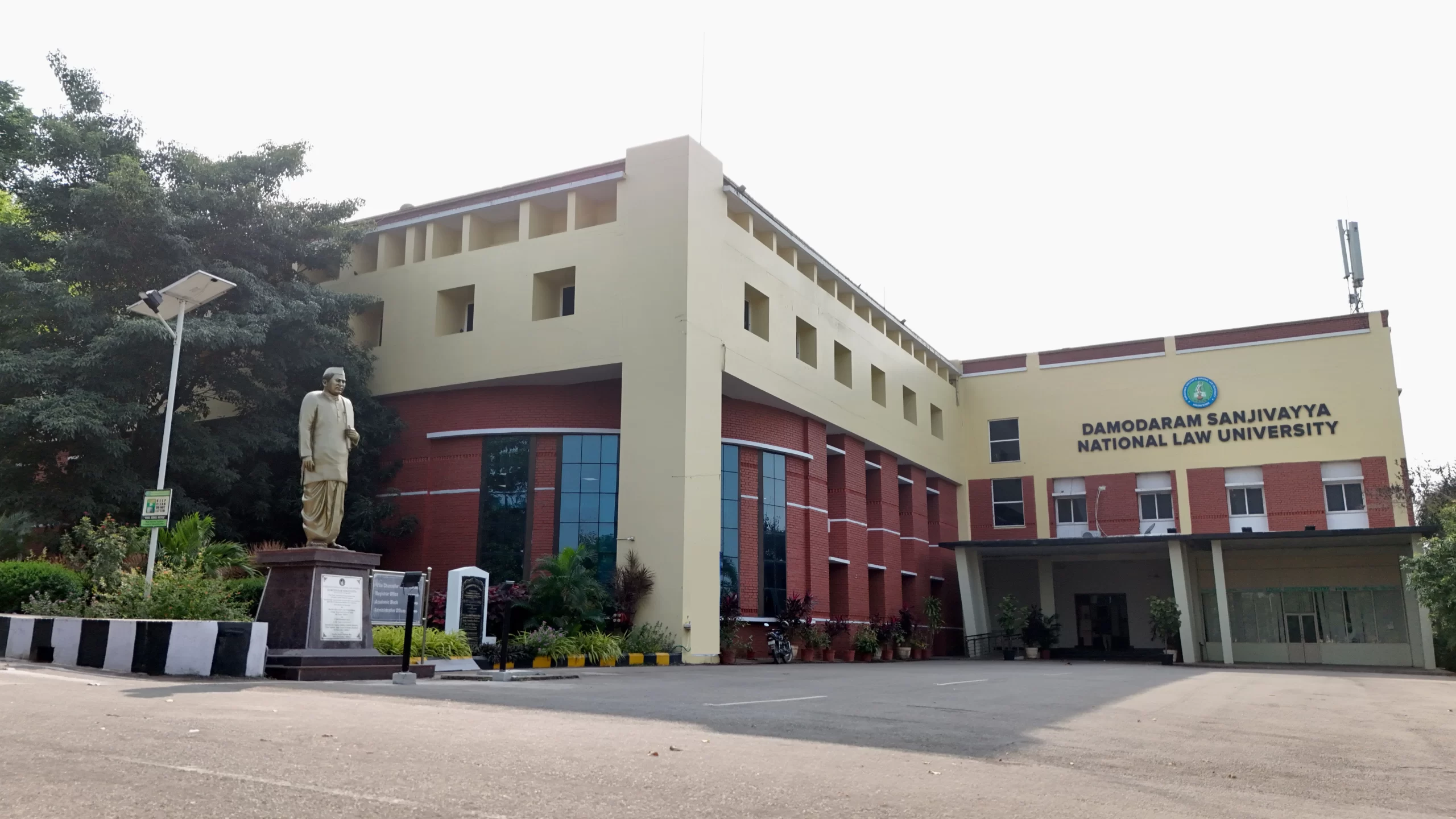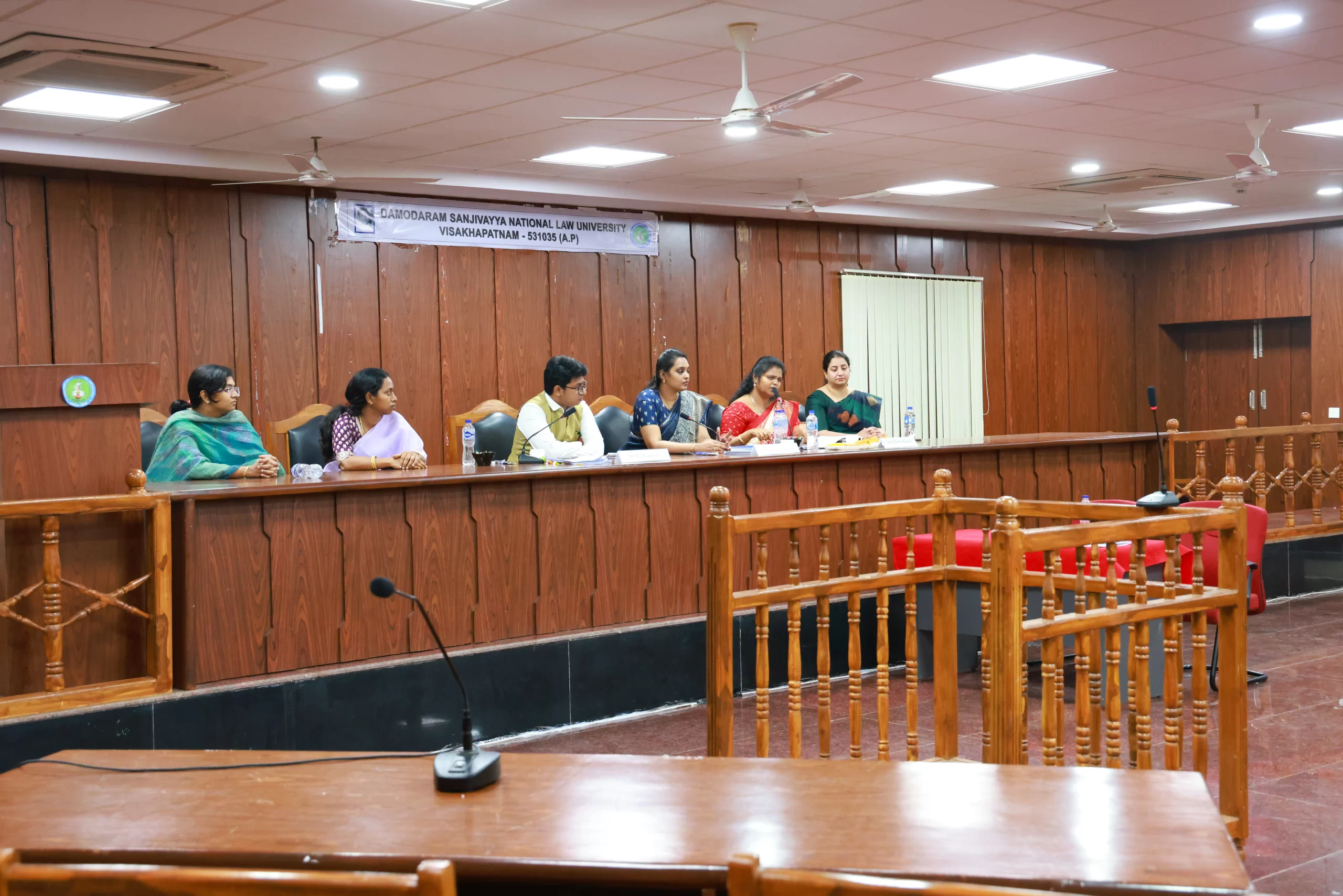 DSNLU state-of-the-art, technologically advanced and eco-friendly campus is situated in 45.5 acres abutting the hill. DSNLU campus has fully air-conditioned Academic Block, Wi-Fi enabled with LAN facility. The University is a part of National Knowledge Network whereas the Government of India has provided 1GBPS connectivity to the University. Boys and Girls Hostels consists of 160 rooms each with two students’ accommodation in a room as per the University Rules. DSNLU has canteen building accommodating 350 students at a time. DSNLU has 11 KV Sub-station with two 320 KVA backup generators, 1.5 KLD capacity Sewage Treatment Plant, Andhra Bank ATM. 350 Kwp Roof Top Solar Power Plant is also established. The students are facilitated with a world-class library which provides access to online resources like Westlaw India, Hein Online, SCC online, Lexis Nexis, Kluwer Competition Law, Kluwer IP Law, Kluwer Arbitration, Taxmann, JSTOR, Economic and Political Weekly and Manupatra for intensive research. The online resources are available through RemoteXs. Further, DSNLU adopts Turnitin, an anti-plagiarism web tool. All the classrooms are equipped with LCD projectors, internet and public address system. DSNLU Moot Court Hall is a splendor in its own way. The University has seminar and conference hall that are made available for conducting meetings and organizing guest lectures.