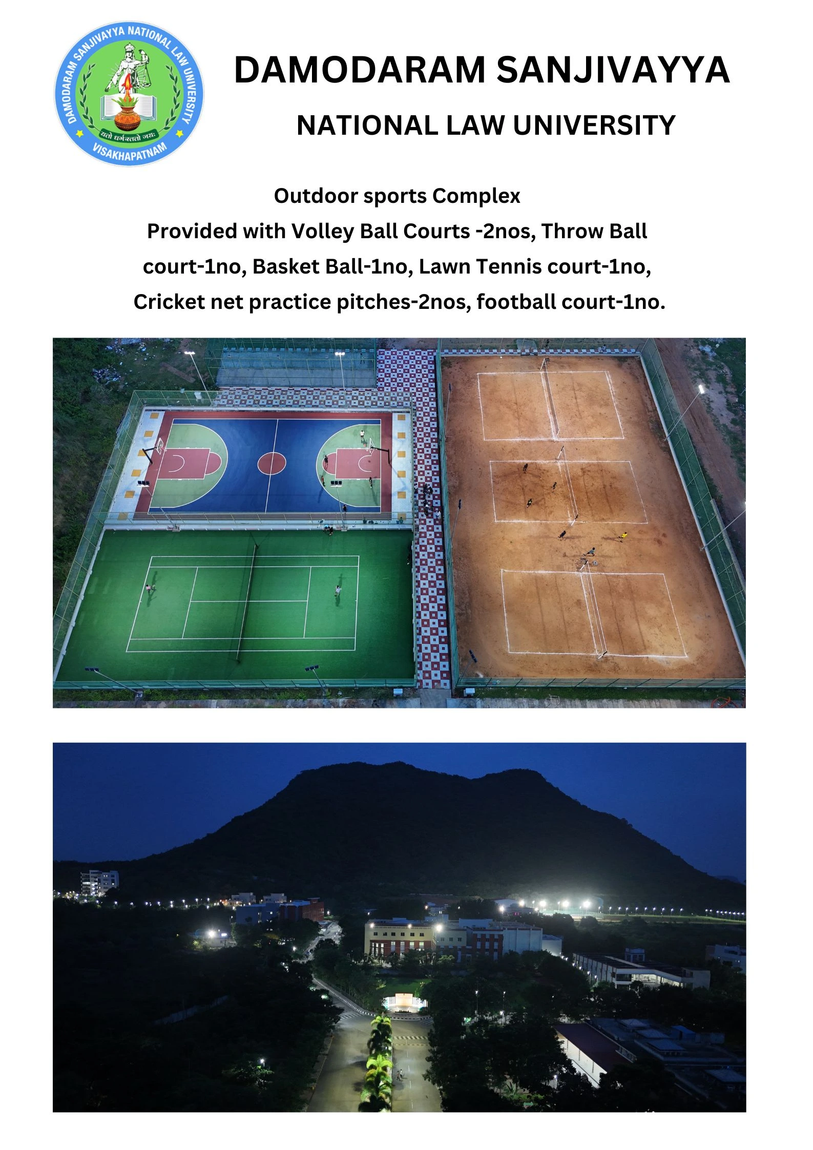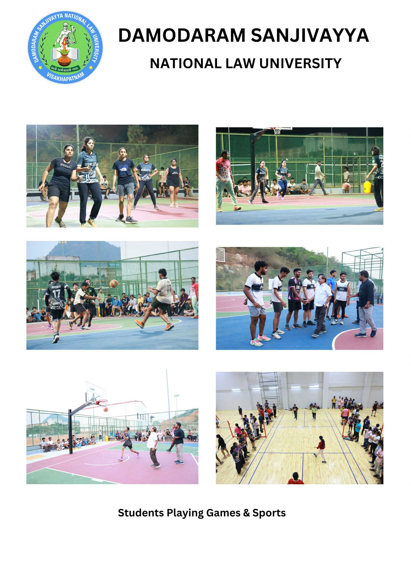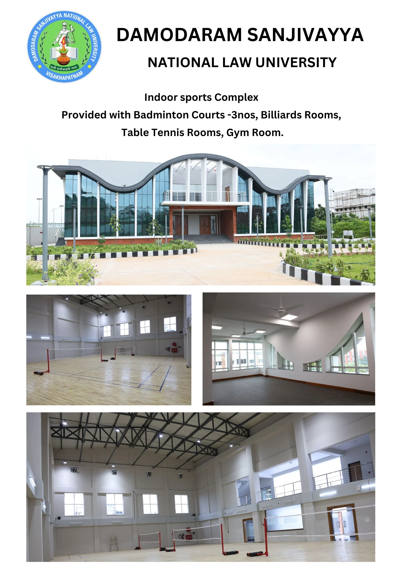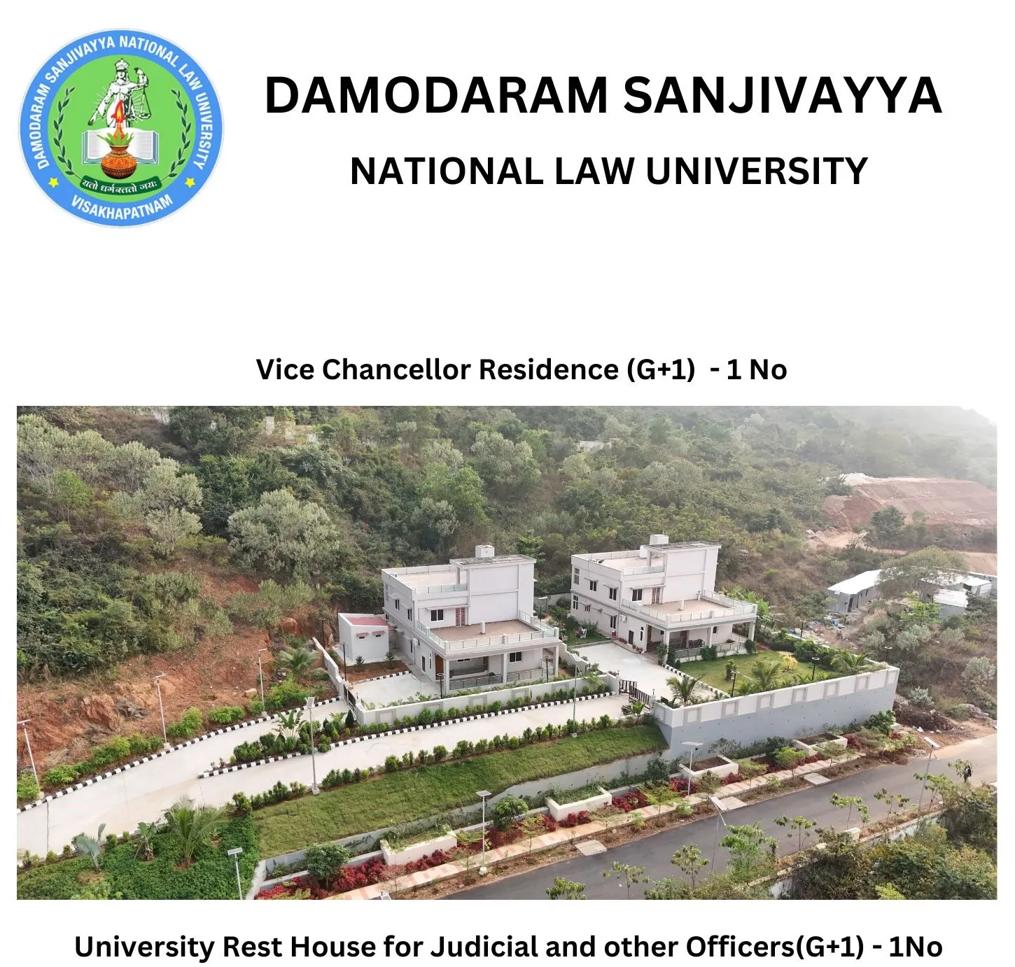 Sports, all the while being important physical exercise, also help develop the character of a human being, by teaching them the importance of discipline and practice and imparting the important lesson of team work. Hence, the sports committee has undertaken the responsibility of inculcating the environment of Sports in DSNLU. The work that the sports committee does inside the university is very well-complimented by the sports infrastructure of our campus. DSNLU provides badminton courts, Table Tennis table(s) and a gym in both the hostels. DSNLU also has a football field, 2 cricket pitches, 2 volleyball grounds, a basketball court, and a lawn tennis court.VC Residence and Judicial Officers Rest House